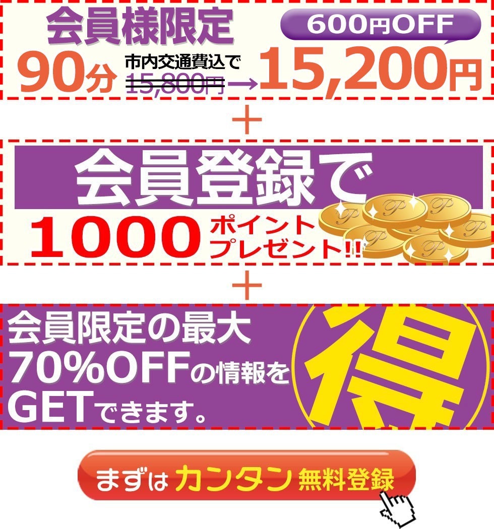 | 90分 指名料込 | 15,200円 (500ポイント付与) |