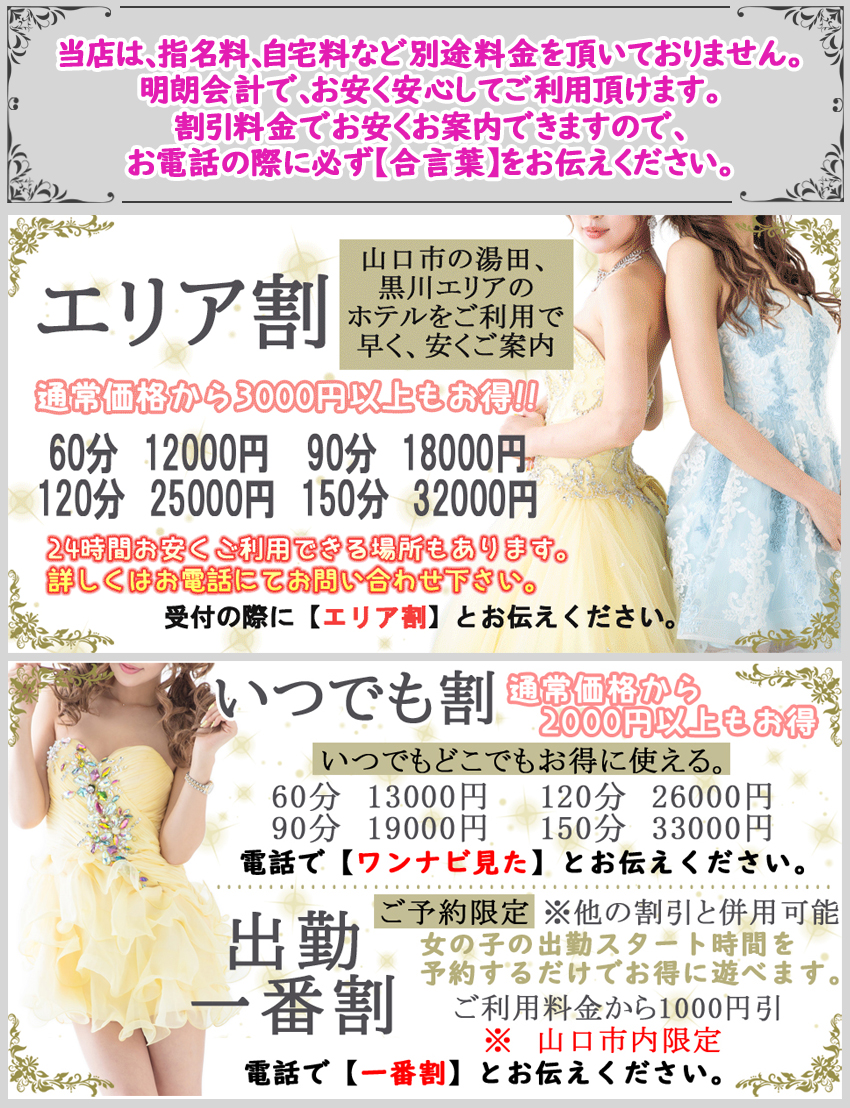 女の子の出勤前に出勤時間の出勤開始時刻のご予約をしていただけると 1000円割引させて頂きます。